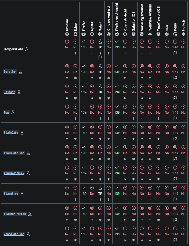 JavaScriptで日付管理を行う場合、Day.jsなどのライブラリを入れるのが主流かと思いますが、このAPIが各種ブラウザで動くようになったらライブラリは不要になりそうですね。(Fetch APIが普及して、その結果axiosがあまり使われなくなった流れに似ている)