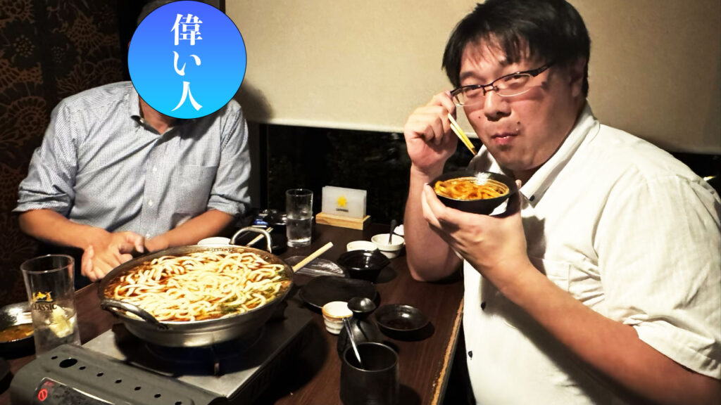 さらには、コース料理であったにもかかわらず、追加のうどん(4人前)までご馳走になり、やや目が虚な人間掃除機です。