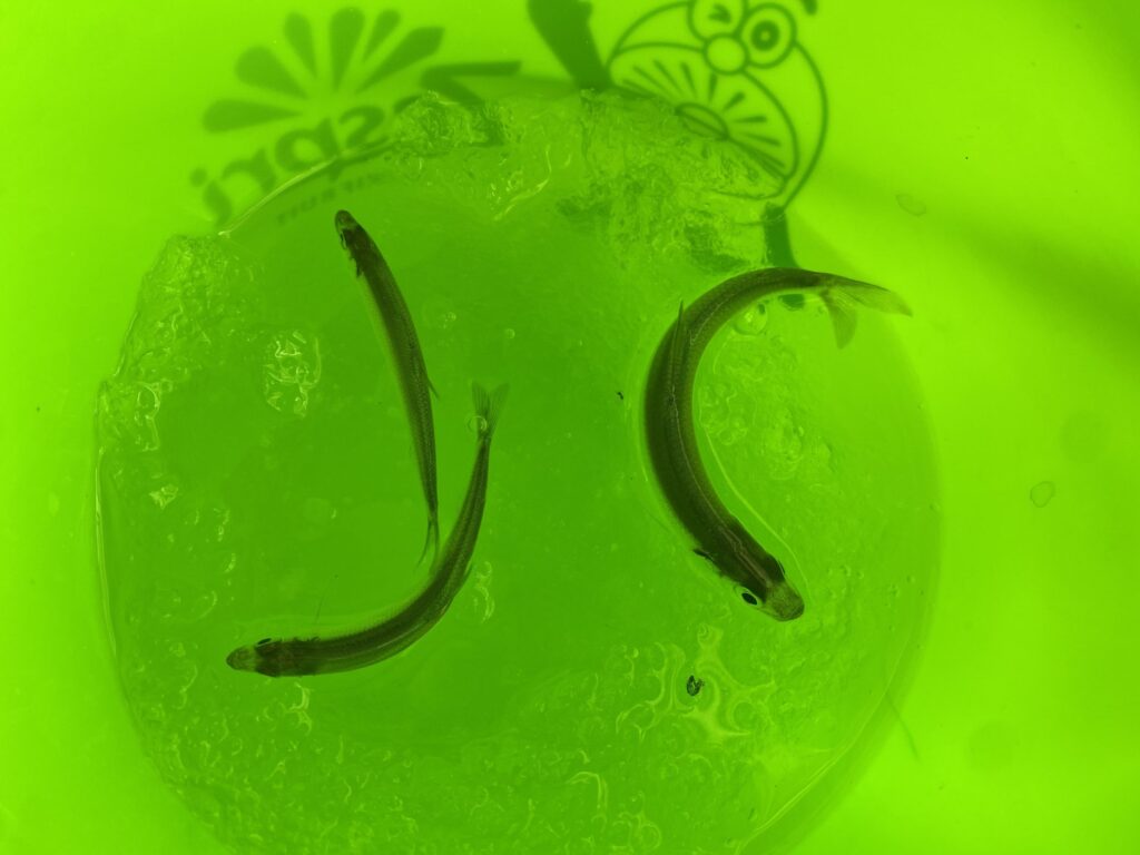 本日の功労者である熊澤の竿に当たりが!釣りあげたら今回で一番大きなワカサギ(写真右)が釣れました。