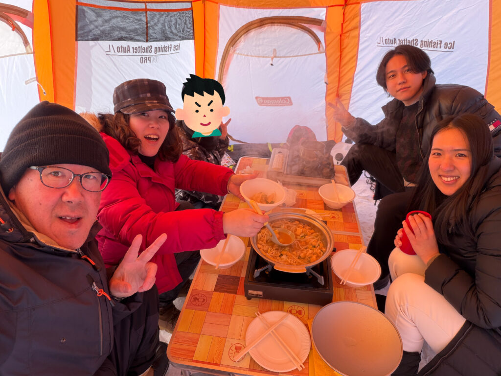 いつもとは違う雰囲気ということもあり、テント設営の苦労やワカサギの釣れなさも吹き飛ぶくらい美味しいお鍋でした。