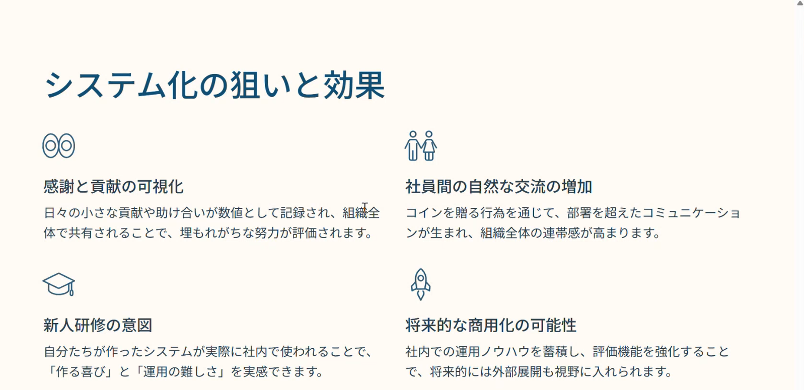 新人が短期間で作れる規模感で、かつ社員みんなが使っていけるシステムを作るのはとても良いと思いました。