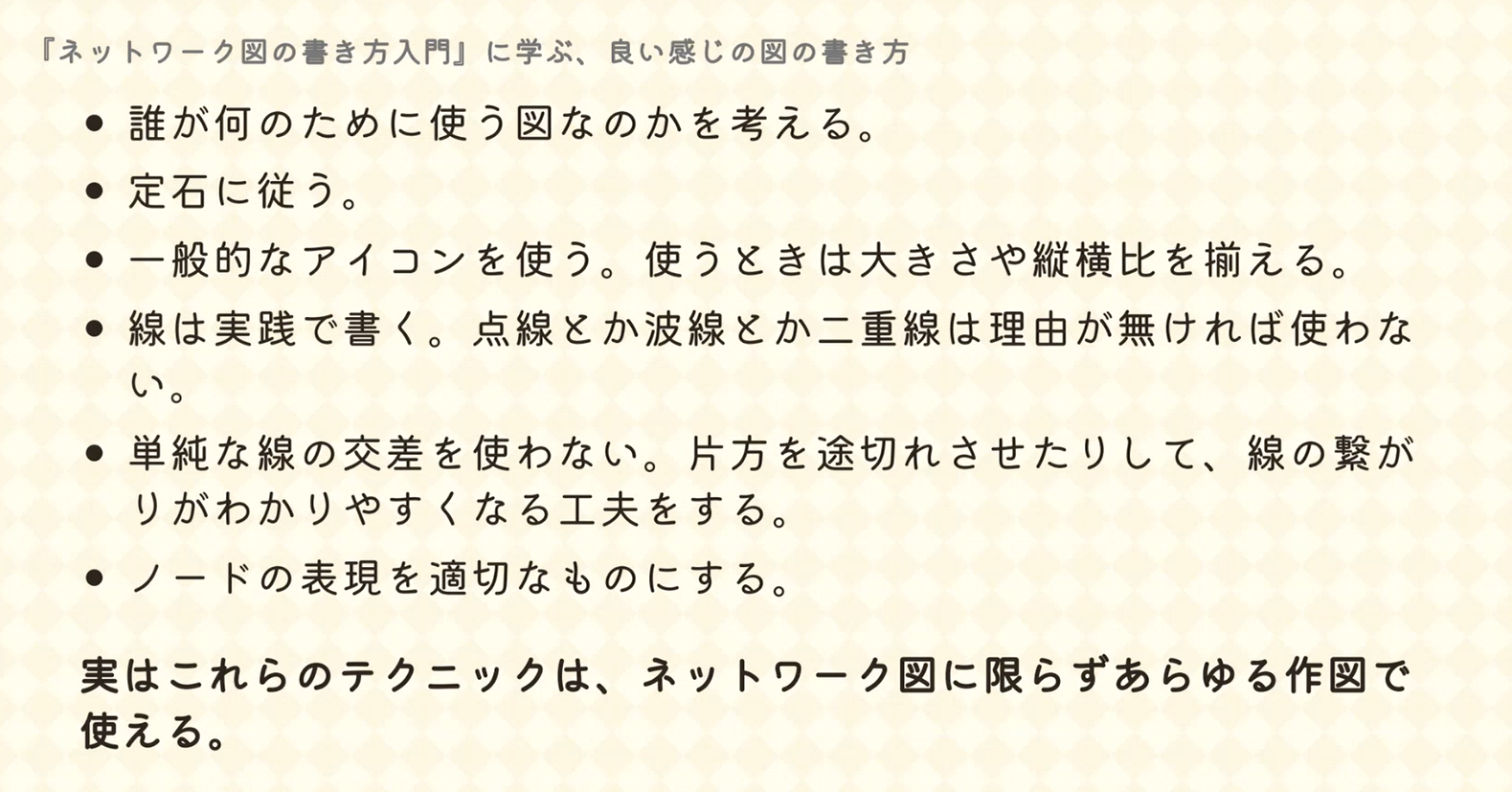 図のある資料を作る機会のあるエンジニアは多いと思います。ネットワーク図だけでなく、様々な資料作りに有用な知識でした。