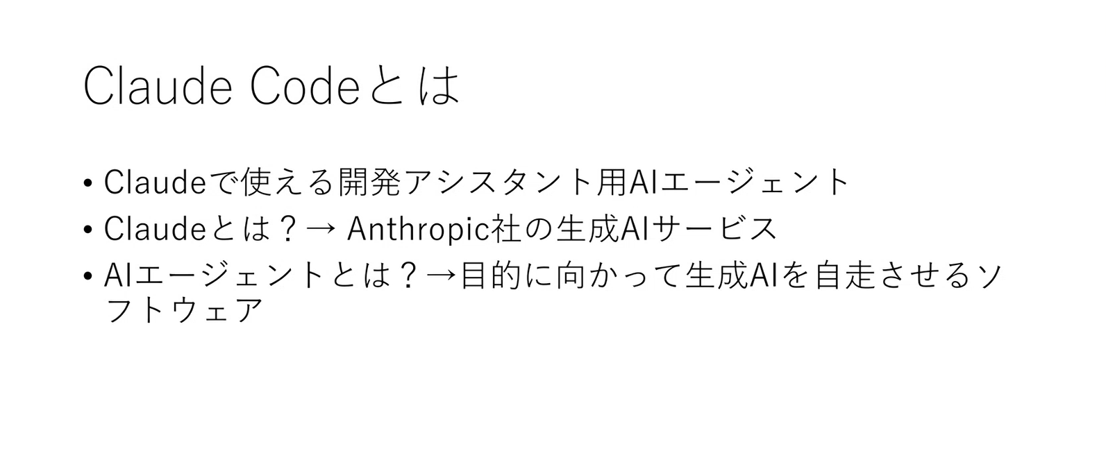 これは私が話した内容です。Claude Codeのようなものを使いこなすことが令和の生産性のスタンダードだと思っているので、がっつり触ってみました、という内容になります。