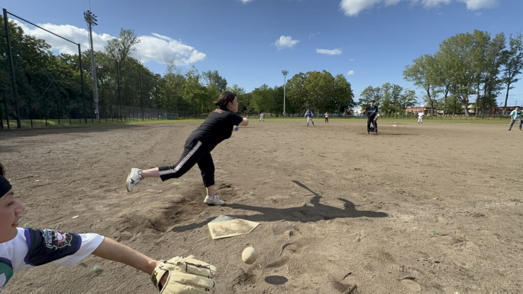 野球経験はないものの、持ち前の運動神経の高さとセンスでピシャリと投げ込み、相手バッターを押さえていきます。