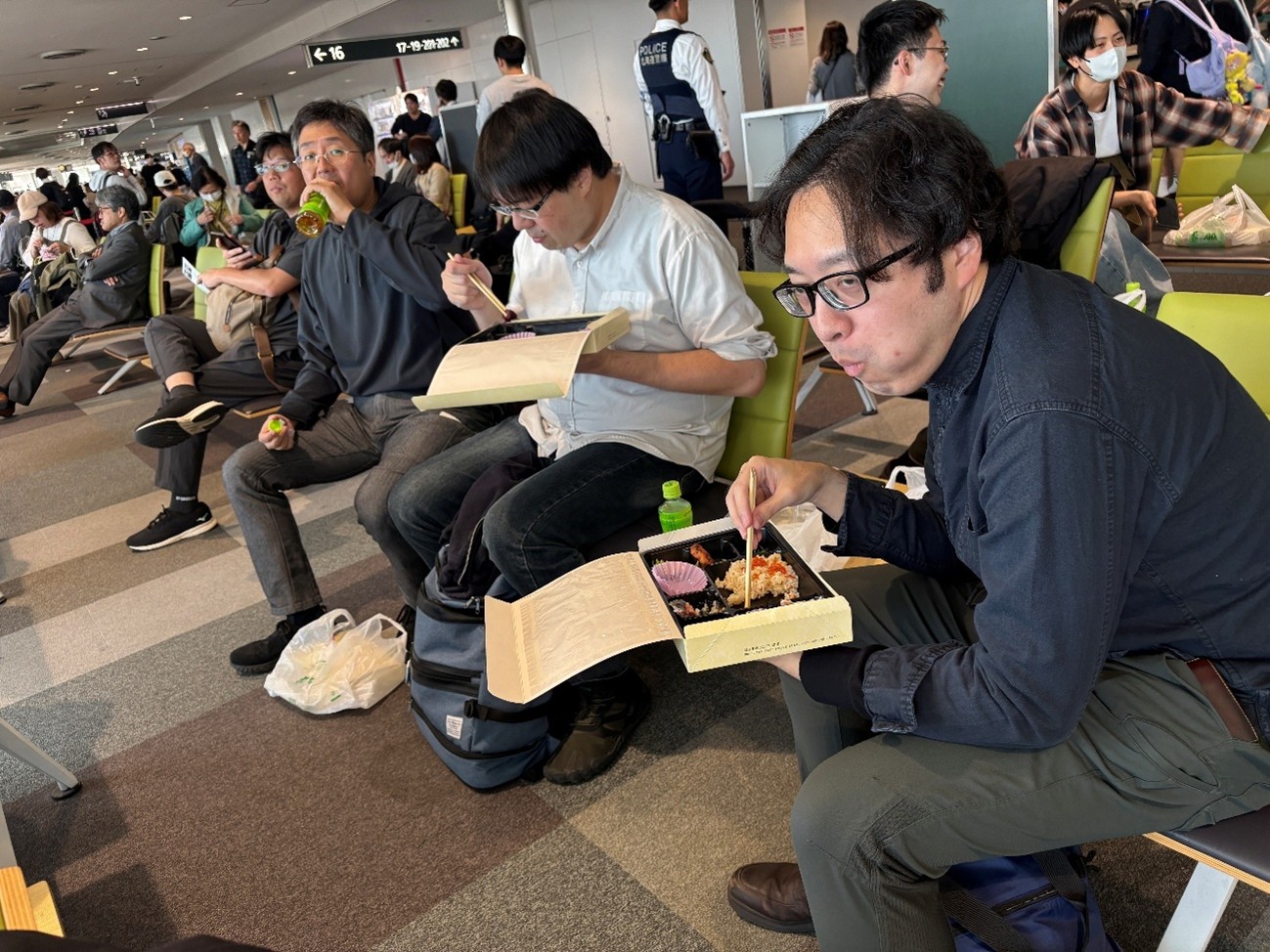 本日のお昼を快適な空の上で過ごす我々には機内で食べるお弁当を受け取って保安検査場を通過・・・と思ったら何やら既にお弁当を食べている社員たちがチラホラチラホラ・・・これはOverEatsな旅になりそうな予感がします。